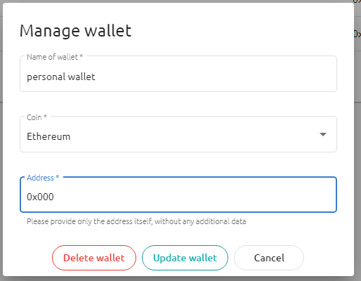 Create a new wallet with your wallet addresses (if multiple wallet addresses are required, separate by , or by space.